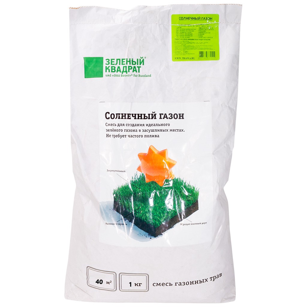 Газонная трава Зеленый квадрат, предназначена для создания идеального зелёного газона на участках с недостатком влаги. Смесь отличается неприхотливостью в уходе и оптимальна для ландшафтного дизайна садовых участков, территорий отелей, образовательных учреждений, парков и спортивных площадок. В состав смеси входят семена лугового мятлика, красной и тростниковой овсяницы, а также многолетнего и итальянского райграса. Эти злаки устойчивы к засухе, что позволяет минимизировать полив газона и сократить потребление воды. Рекомендуется сеять семена в мае в дренированную почву. Благодаря большой зелёной массе смесь эффективно подавляет рост сорняков, что позволяет газону сохранять первоначальный внешний вид на протяжении длительного времени.