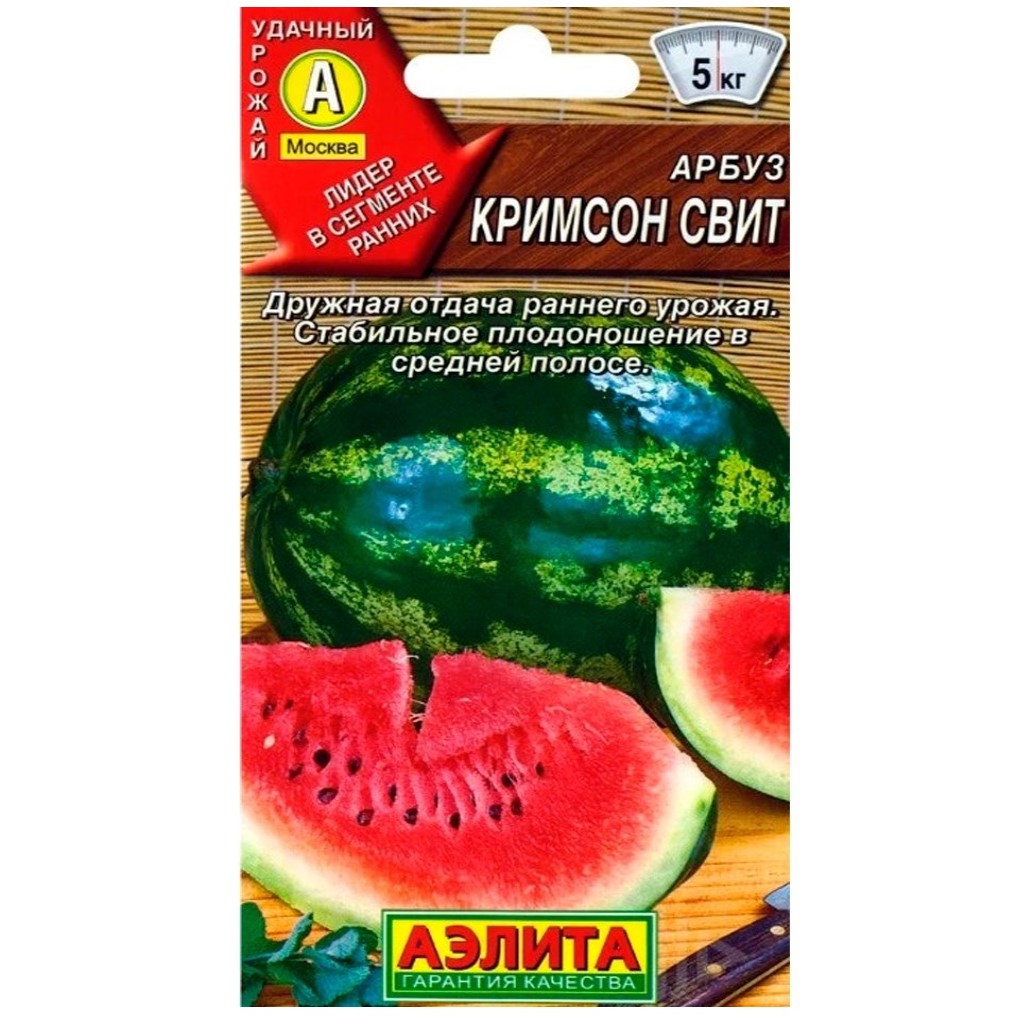 Арбуз Кримсон свит, лидер среди арбузов в сегменте ранних – в начале арбузного сезона на прилавках доминирует именно этот сорт. Скороспелый, от всходов до начала плодоношения 70-80 дней. Растения среднеплетистые. Плоды массой 3,5-5 кг. Красная, сладкая, с зернистой структурой мякоть – мечта гурманов. Сорт сравнительно малосеянный, с мелкими семенами.