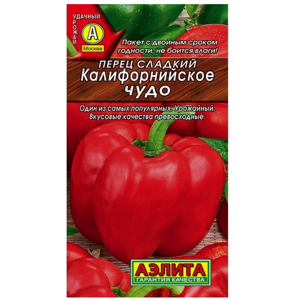 Перец сладкий Калифорнийское чудо, один из самых популярных сортов. Раннеспелый – среднеранний, от всходов до первого сбора 100-129 дней. Неприхотлив, хорошо адаптируется в разных регионах. Легко переносит резкие перепады температур. Устойчив к пониженной освещенности. Растения высотой 70-80 см. Плоды мясистые, толстостенные, массой 130-160 г. Аромат сильный. Вкус превосходный. Урожайность 4-6 кг/м2.