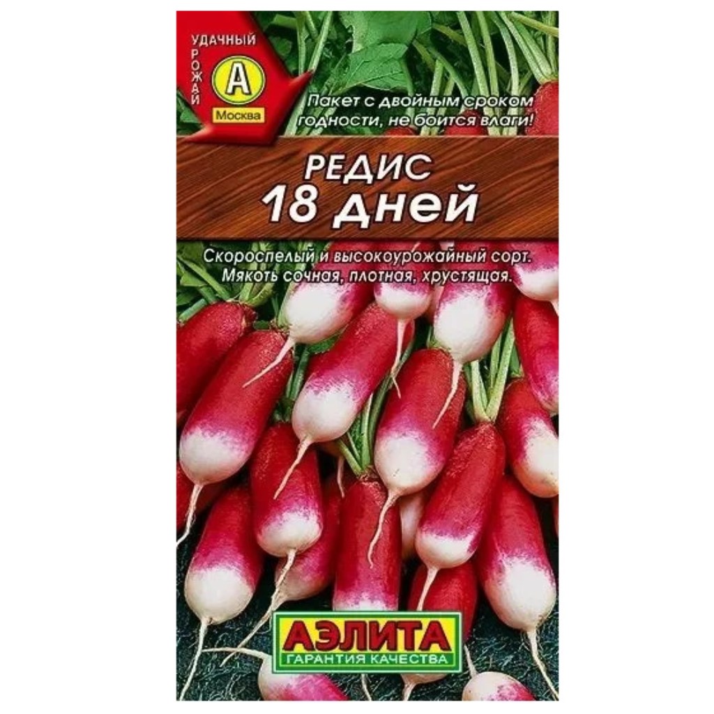 Редис 18 дней, скороспелый и холодостойкий сорт для выращивания в огород и защищенном. Ценится за высокое качество продукции. При раннем посеве под пленку формирует урожай за 18-20 дней. Корнеплоды массой 15-20 г. Мякоть белая. Вкус отличный, со сладостью. Корнеплоды не надо передерживать в грунте, чтобы не было пустот. Урожайность высокая – 2,5-3 кг/м2.