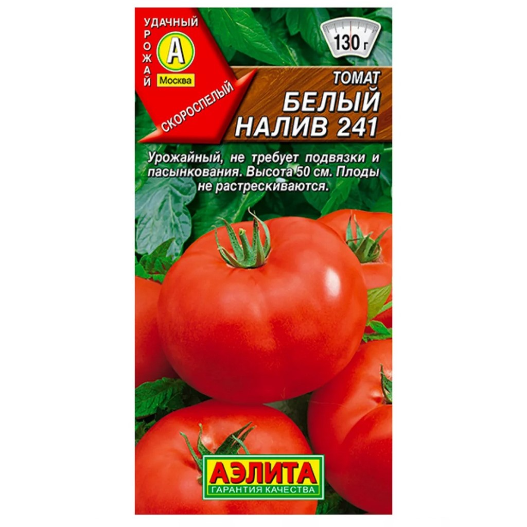 Томат Белый налив 241, предназначен для закрытого грунта. Один из самых надежных и популярных скороспелых сортов. Первый урожай в открытом грунте собирают уже на 90-100 день после всходов, в защищенном – на 80-90 день. Растения детерминантные, высотой 50 см (в теплицах могут превышать 70 см). Плоды массой 80-130 г, высокого качества, устойчивые к растрескиванию. Они обладают не только отличным внешним видом, но также отменным вкусом. Используются в свежем виде, подходят для переработки и консервирования. Сорт неприхотливый, хорошо переносит пониженные температуры и дает высокий урожай 5-8 кг/м2 в огороде.