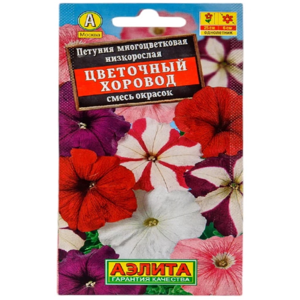Петуния Цветочный хоровод, обильно цветущая смесь кустовых петуний. Кусты компактные, крепкие, высотой до 25 см. Цветки диаметром 5-6 см. Цветение плотное, скрывает листву и побеги. Сроки начала цветения очень ранние. Растения хорошо переносят неблагоприятные погодные условия. Смесь рекомендуется для ковровых и бордюрных посадок в цветниках и контейнерного выращивания.