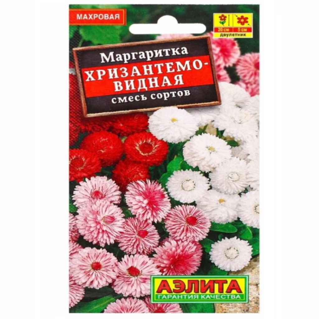 Маргаритка Хризантемовидная смесь маргариток с очаровательными махровыми соцветиями диаметром 4-5 см. Растение формирует компактную прикорневую розетку листьев с цветоносами высотой 15-20 см. Многолетнее и зимостойкое по природе, в цветоводстве оно часто используется в качестве двулетнего. Смесь подойдет для контейнерного озеленения, оформления ярких бордюров в саду, украсит альпийские горки, низкорослые садовые цветники.