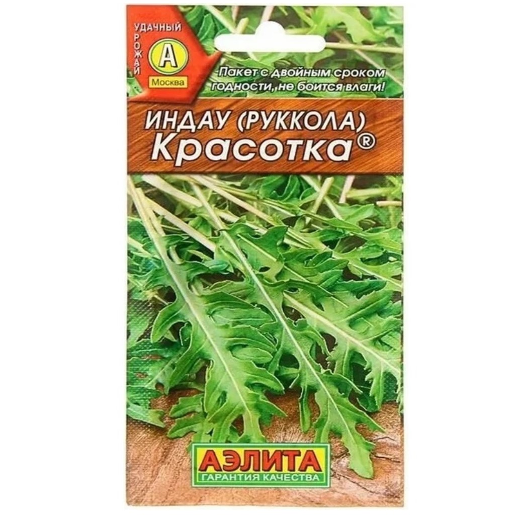 Индау (руккола) Красотка, раннеспелый сорт рукколы для открытого и защищенного грунта. От всходов до начала хозяйственной годности 22-27 дней, до цветения – 60 дней. Розетки листьев диаметром 20-22 см, массой 20-25 г. Листья крупные, нежные, сочные, с великолепным пикантным вкусом. Используется в свежем виде. Урожайность зелени 2.1-2.4 кг/м2.