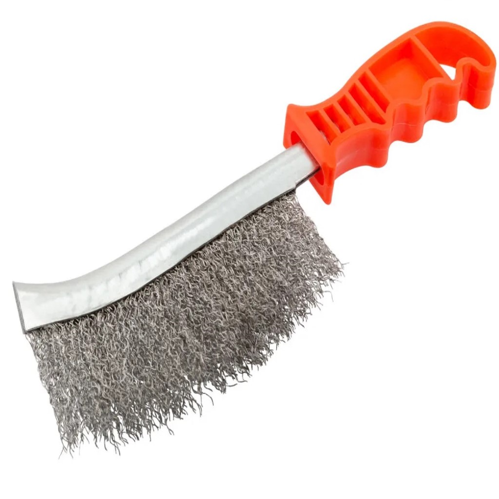 Щетка стальная Курс типа А предназначена для удаления ржавчины, старого слоя краски и загрязнений, зачистки металлических, деревянных и других поверхностей. Рабочая часть щетки представляет собой волнистую проволоку из стали. Пластмассовая ручка защищает от ударов и обеспечивает удобный хват. Применяется для тяжелых зачистных работ.