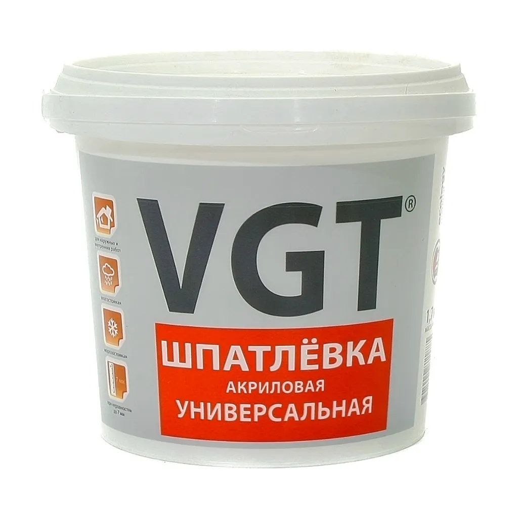 Шпатлевка акриловая VGT «Универсальная» для наружных и внутренних работ по выравниванию деревянных, бетонных, оштукатуренных поверхностей. Свойства: не мелит; дает прочную и гладкую мато...