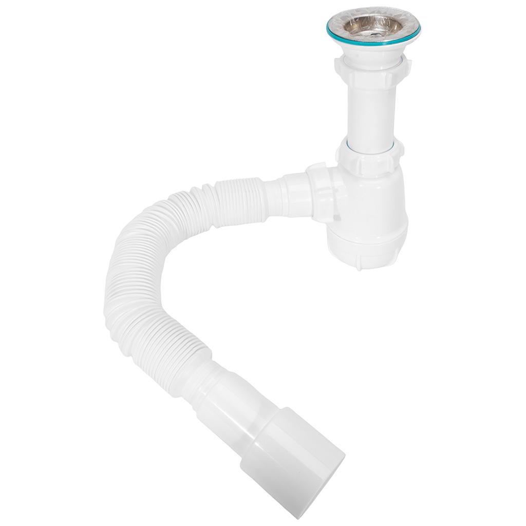 Сифон для мойки Aquant, используется для раковин и моек с диаметром сливного отверстия 50 мм и решеткой 70мм. Сифон в комплекте с гофротрубой с универсальным выходом под два диаметра 40/50мм для подключения к канализации. Конструкция позволяет легко разбирать и чистить стакан от мусора, не снимая весь сифон. Сифон изготовлен из высокопрочного ABS-пластика. Выпуск и маховик выполнены из устойчивого к коррозии ПВХ.