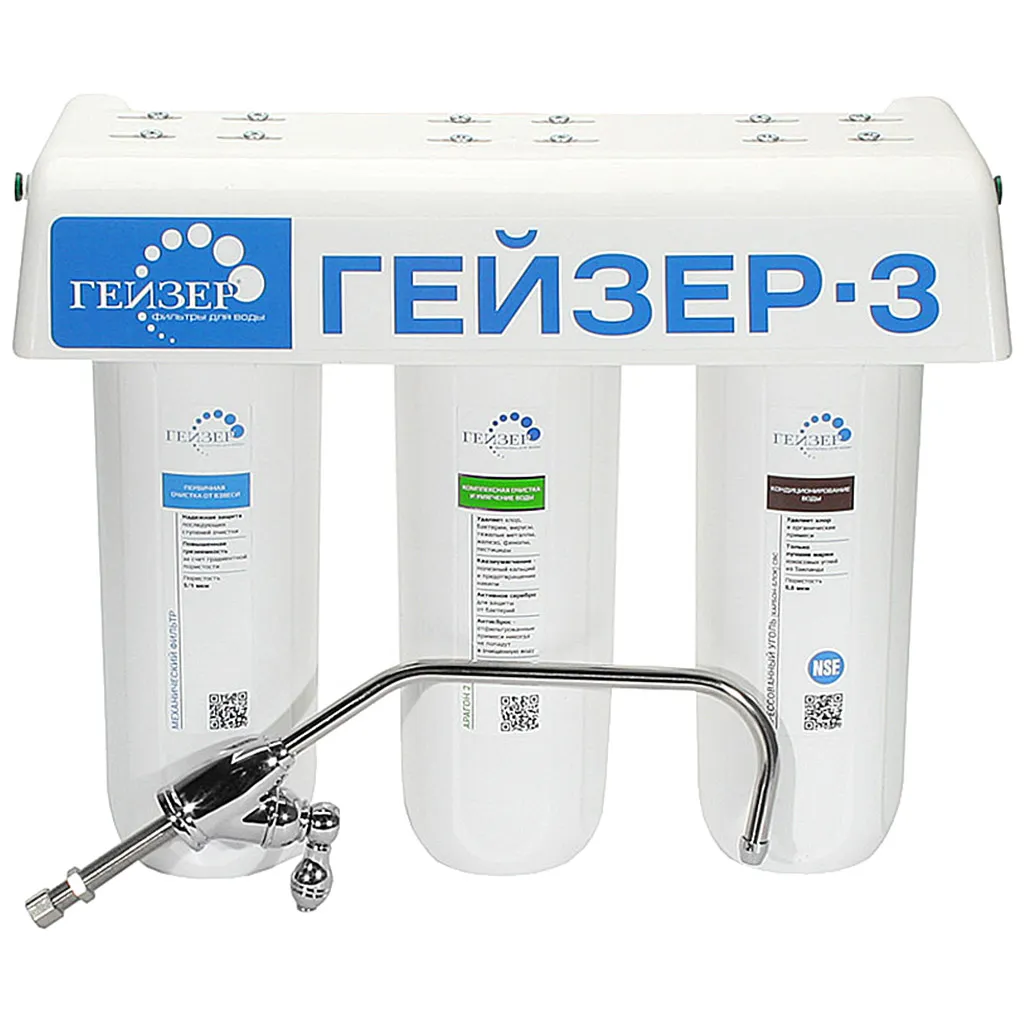 Трехступенчатый фильтр Гейзер-3, предназначен для очистки водопроводной воды от хлора, тяжелых металлов, нитратов, пестицидов, избытка солей жесткости и других примесей. Трехступенчатый фильтр Гейзер устанавливается под мойку. Картридж БАФ, содержащий мультикомпонентную загрузку на основе сорбентов и ионообменных материалов. Это позволяет удалять не только хлор и органические примеси, но и снижать содержание железа и тяжелых металлов. Ресурс картриджа БАФ до 10000л.