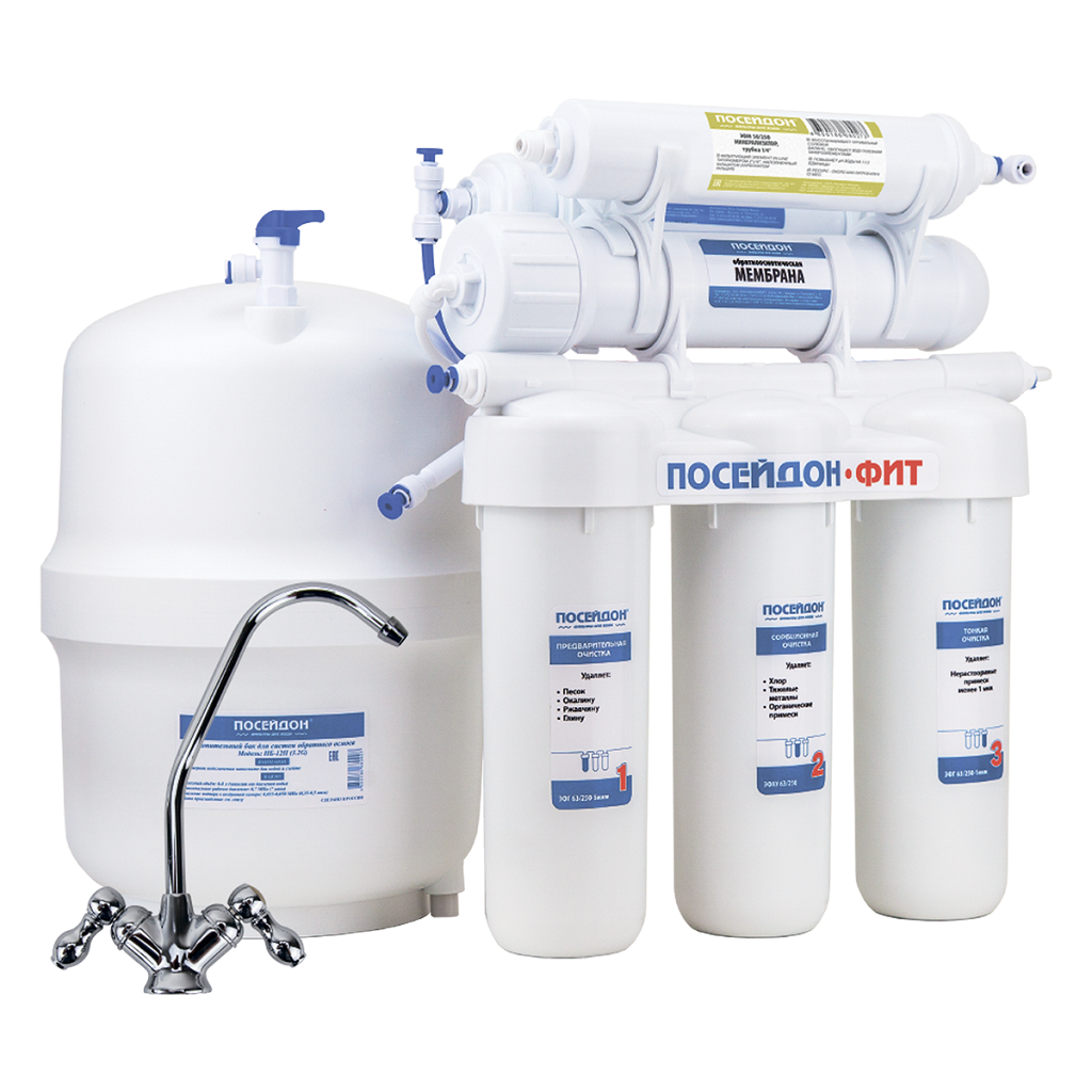 Шестиступенчатый фильтр Посейдон ОСМО-50М Фит, предназначен для очистки водопроводной воды от вредных для здоровья примесей: механических (ржавчины, ила, песка и т.п.), растворенных (свободного хлора, хлорорганических соединений, тяжелых металлов, радиоактивных элементов, солей жесткости) и иных органических и неорганических веществ, бактерий и вирусов. Водоочиститель полностью решает проблему накипи. Устраняет неприятные запахи, улучшает вкус воды.