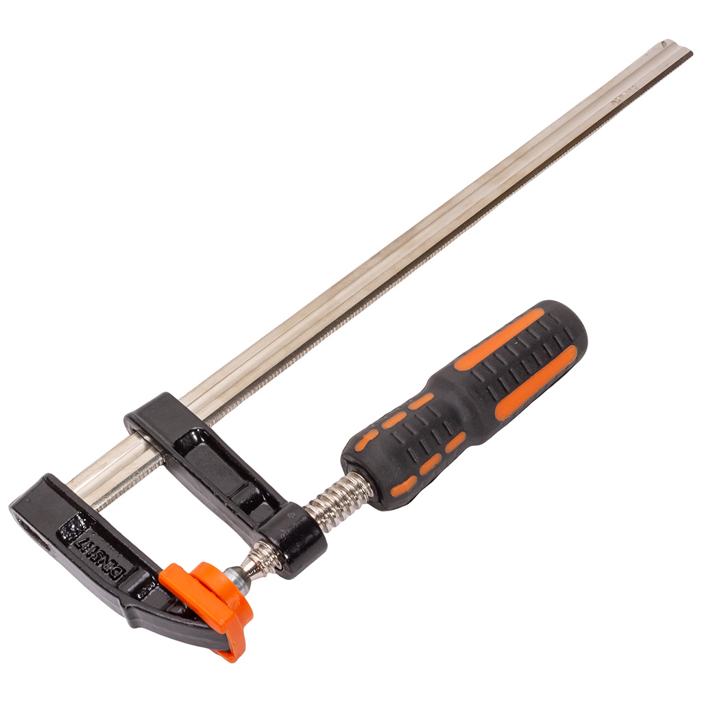 Струбцина выполнена из качественных и прочных материалов, что обеспечивает надежность и долговечность. На губках имеются защитные колпачки для предотвращения повреждения деталей при эксплуатации. Эргономичная обрезиненная рукоятка обеспечивает комфортную работу.