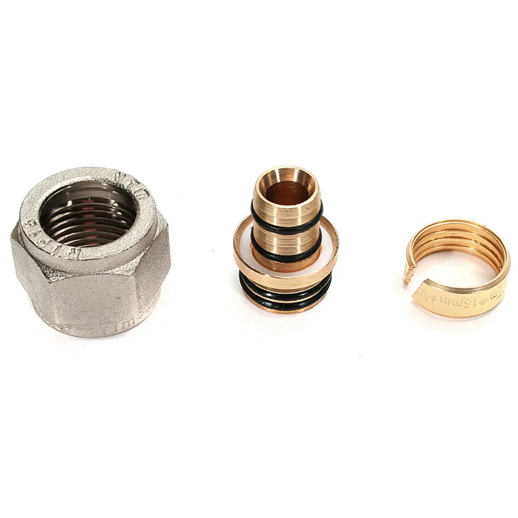 Соединительный фитинг с накидной гайкой и обжимным кольцом используется для подключения металлополимерной трубы к коллектору с выходами диаметром 1/2", стандарт соединения – «евроконус».