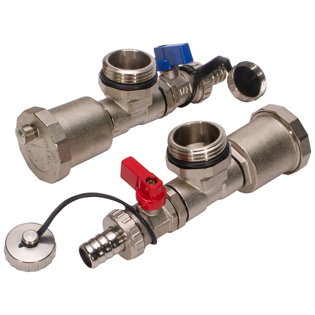 Тройник концевой в сборе для коллекторных групп (пара), используется в коллекторных группах для обеспечения возможностей автоматического выпуска воздуха, который может образовываться в системе отопления при запуске, ремонте или эксплуатации, а так же локальном сливе теплоносителя.