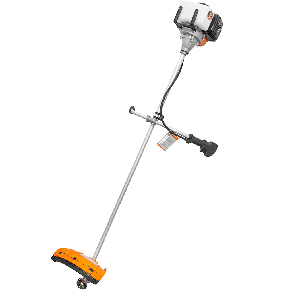 Sturm! BT143 – универсальная бензиновая коса бытового класса для ухода за приусадебной территорией площадью до 1000 кв. метров. Инструмент имеет классическую компоновку с прямой неразъемной алюминиевой штангой и кованым стальным валом внутри, нижним понижающим редуктором и Т - образной рукоятью велосипедного типа – такая компоновка обеспечивает необходимый запас по прочности и удобна в эксплуатации для пользователя, особенно при обработке больших участков и работах на пересеченной местности. Модель оснащена мощным и экономичным двухтактным двигателем рабочим объемом 42.7 куб см (мощность 3 кВт), позволяющим уверенное использование в качестве режущей оснастки не только косильных головок с леской разных видов, но и металлических ножей, рассчитанных на скашивание густой травы, кустарников, сухостоя. Легкость запуска инструмента гарантирует механизм облегченного старта со специальной дополнительной пружиной. Благодаря праймеру, легкому доступу к свече зажигания, и, полупрозрачному топливному баку модель проста и удобна в обслуживании. Инструмент имеет расширенную базовую комплектацию, куда входят ременной подвес (через одно плечо), косильная головка для лески и трехзубый нож.