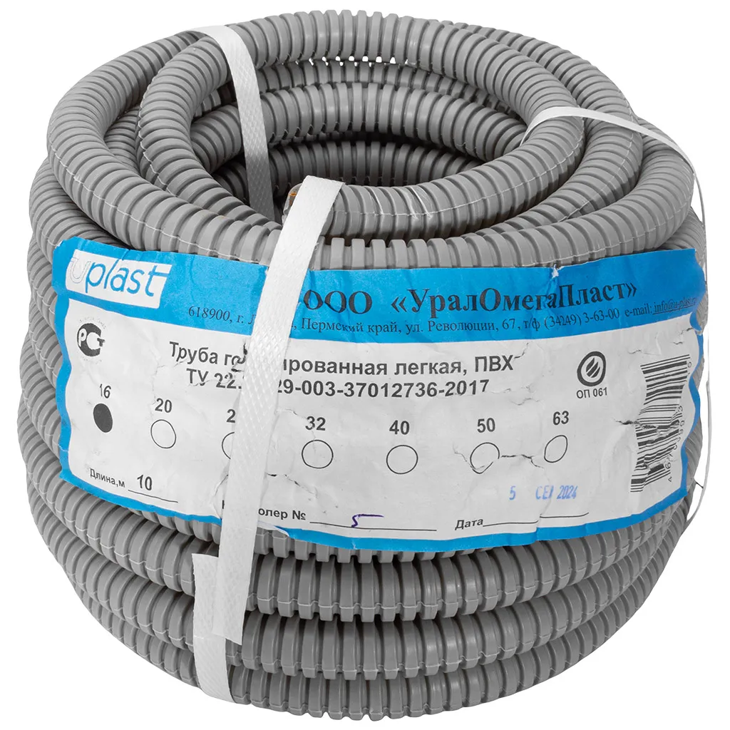 Труба ПВХ гофрированная с протяжкой Ю-пласт, D16мм, серая, 10м