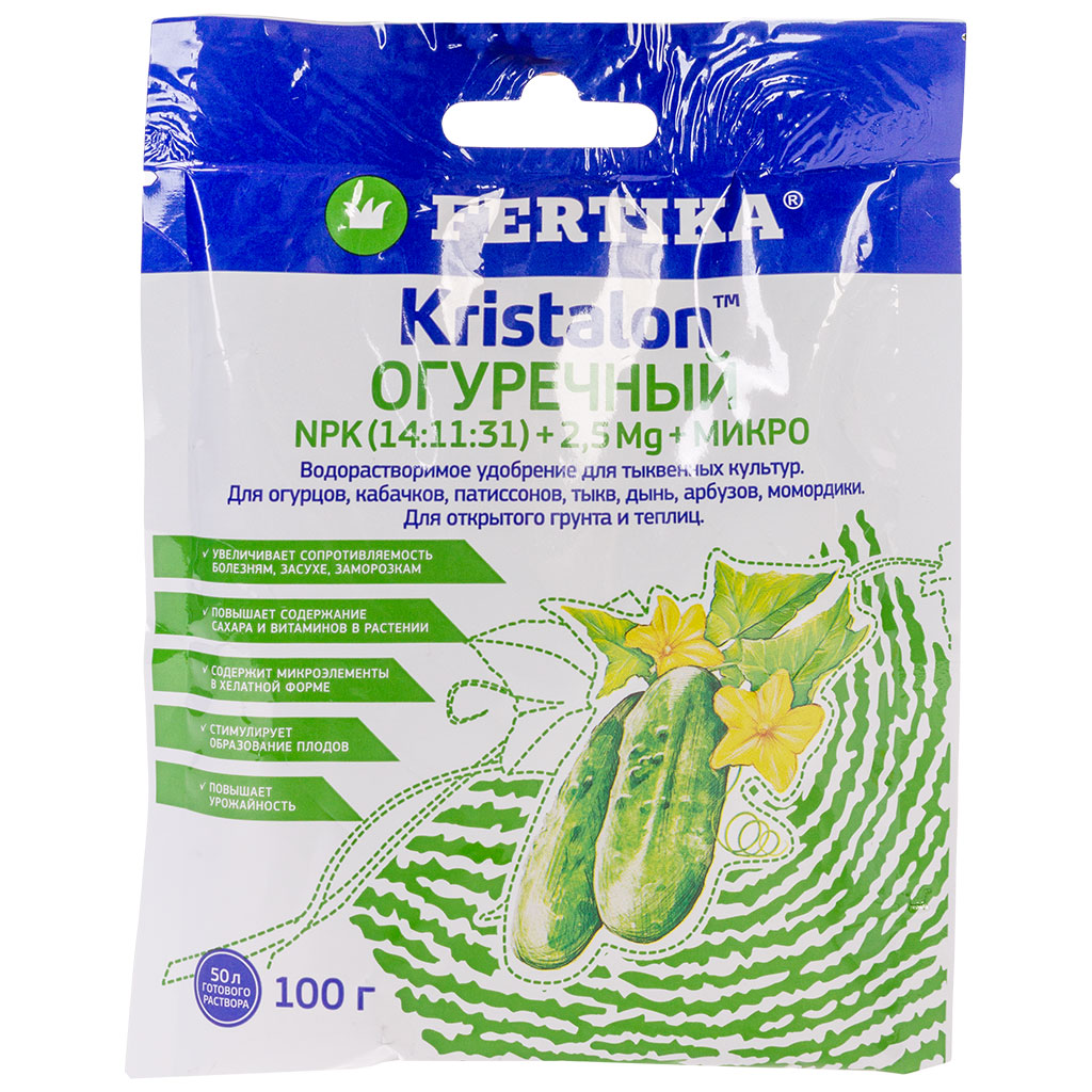 Удобрение Фертика Кристалон, комплексное водорастворимое удобрение для огурцов целевого назначения. Удобрение в упаковке 100гр рассчитано для применения садоводами и огородниками на небольшой площади. Имеет хорошо сбалансированный макро- и микроэлементный состав для использования при выращивании всех культур семейства тыквенных, в том числе огурца в открытом грунте и теплицах.