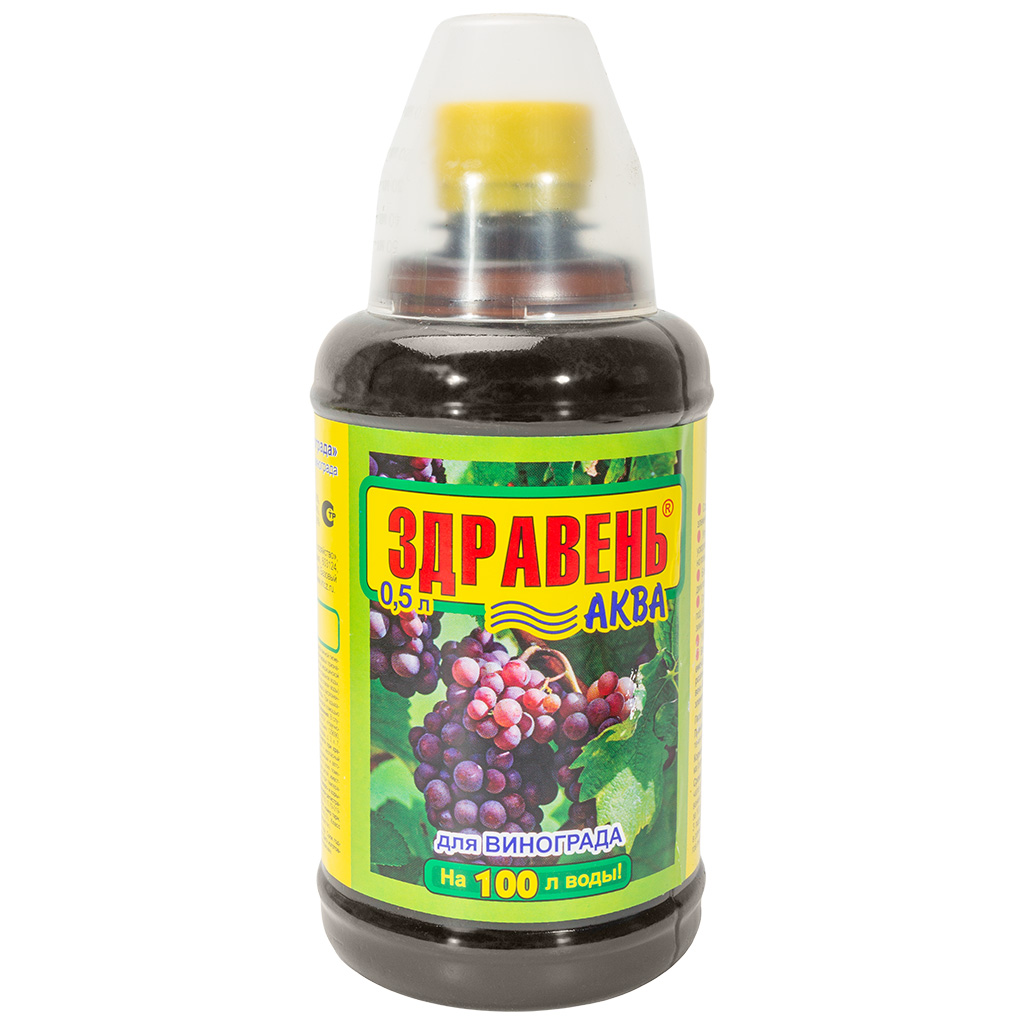 Здравень аква, жидкое комплексное органоминеральное удобрение для корневой и некорневой подкормки винограда в личных подсобных хозяйствах. Улучшает развитие и функционирование корневой системы, ускоряет рост и развитие более мощной лозы и листьев, значительно повышает урожайность. Способствует активной закладке плодовых и зимующих глазков под урожай следующего года, лучшему вызреванию лозы для зимовки. Удобно в применении, легко и точно дозируется, экономично. Содержит оптимальный для винограда набор макро и микроэлементов. Не содержит хлора.