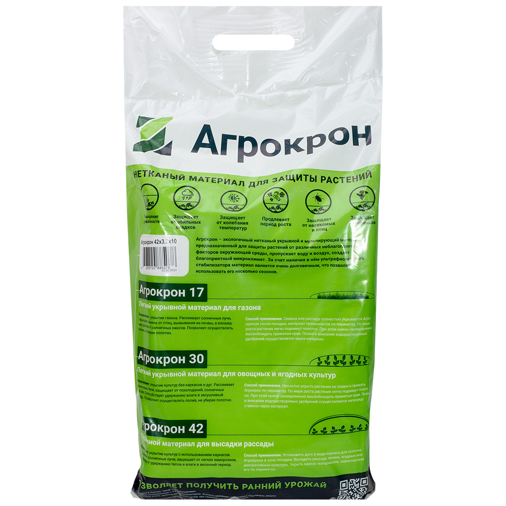 Полипропиленовый (состав 100% полипропилена) нетканый термоскрепленный материал Агрокрон, с удлиненным сроком службы. Защищенные этим нетканым укрывным материалом растения могут расти и плодоносить с ранней весны и до глубокой осени, поскольку им не страшны заморозки до -9°С.