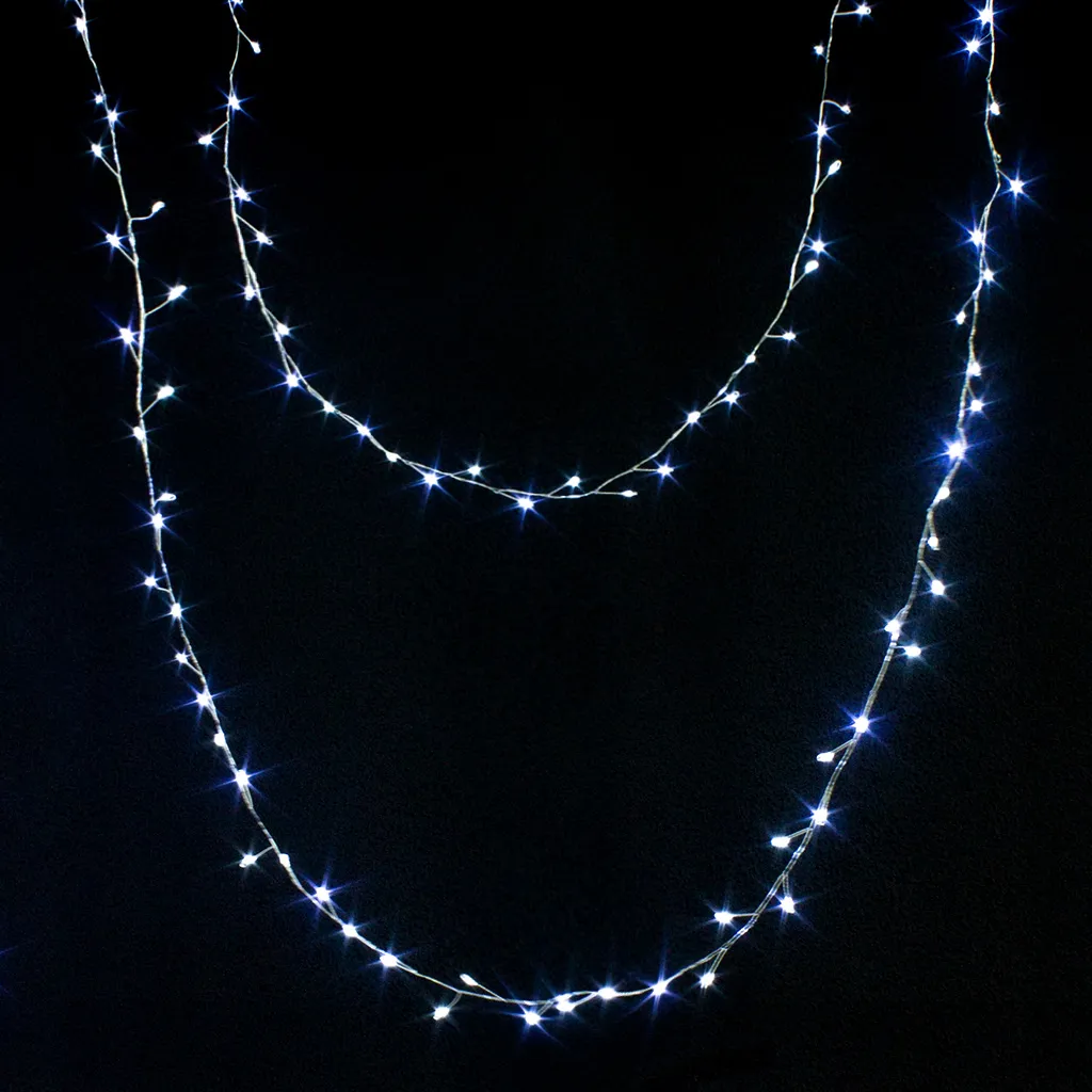 Тонкая проволока практически незаметна, поэтому такие гирлянды используются не только в качестве новогоднего украшения, а еще и в круглогодичном декорировании торжеств, интерьера и сада.