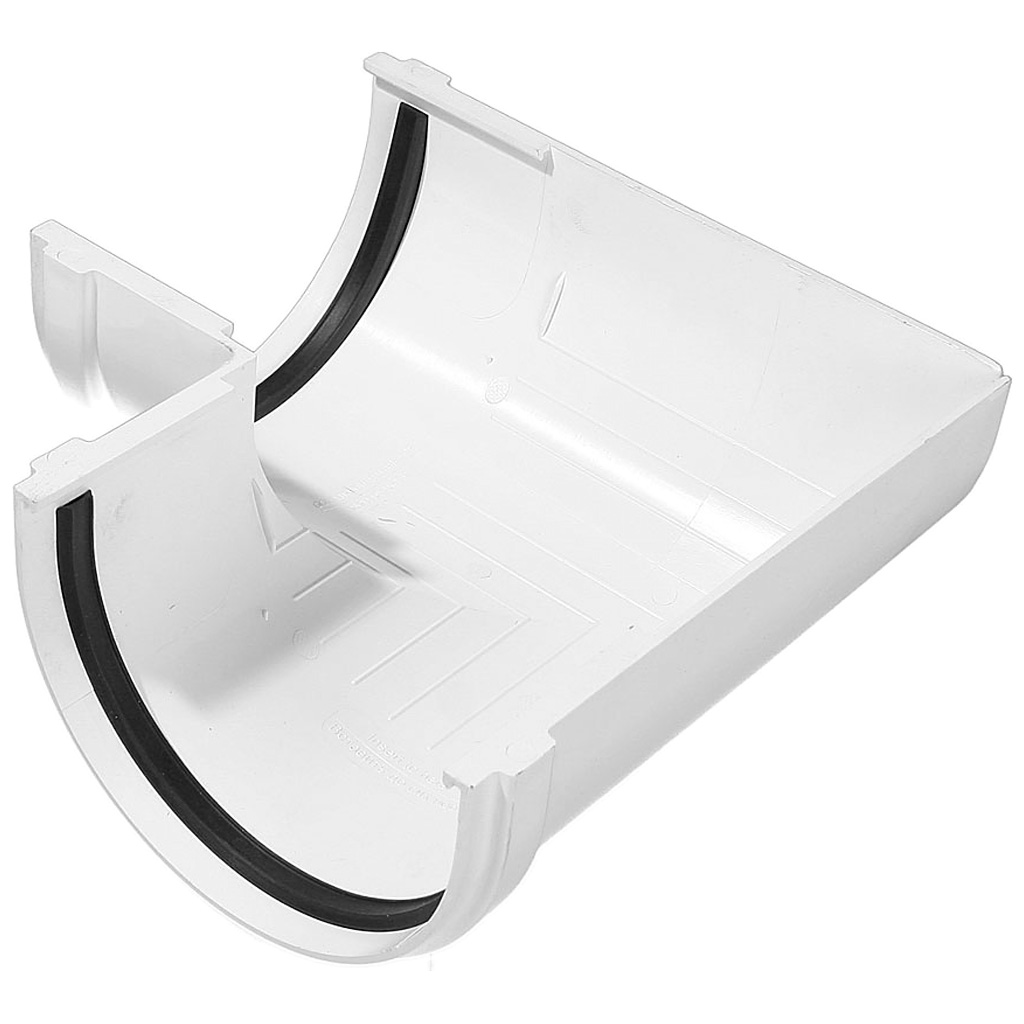 Угловой элемент устанавливается на внешних и внутренних углах кровли и предназначен для соединения желобов под углом 90° в целях изменения направления движения воды.