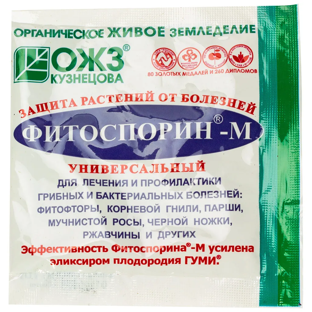 Фитоспорин-М порошок - микробиологический препарат предназначенный для защиты огородных, садовых, комнатных и оранжерейных растений от комплекса грибных и бактериальных болезней (фитофтороза, корневой гнили, парши, мучнистой росы, черной ножки, ржавчины, альтернариоза, фузариоза и др).