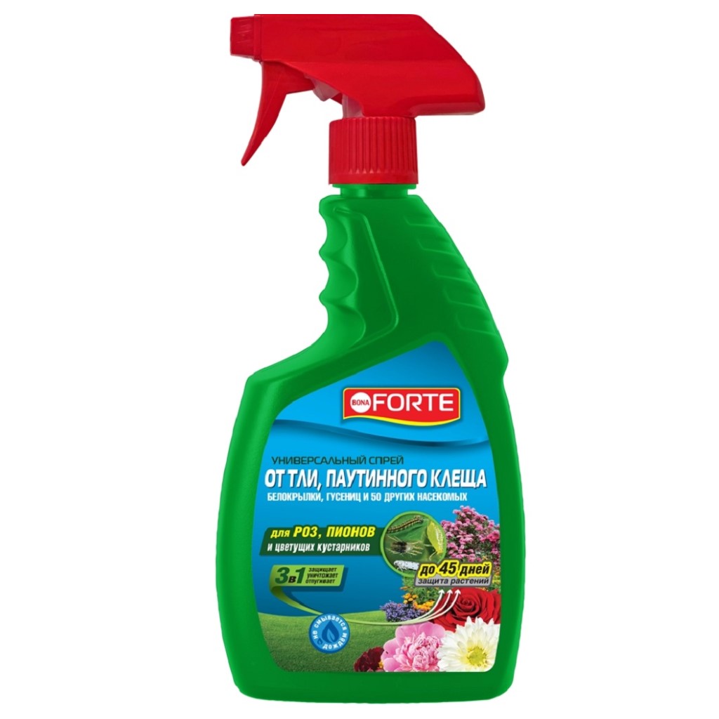 Спрей Bona forte, универсальное инсектоакарицидное средство для защиты комнатных и садовых растений от тли, паутинного клеща, белокрылки, трипсов и других вредителей (более 50 видов). Действует контактно, обеспечивая быстрое уничтожение, отпугивающий эффект и защиту до 45 дней. Препарат удобен в применении, не смывается дождем через 1 час после обработки. При обработке цветов и декоративных кустарников средство не только избавляет от тли, паутинного клеща, белокрылки и гусениц, но и эффективно борется с рядом других насекомых-вредителей: клещи, майские жуки, совки, долгоносики, цикадки, минирующие насекомые, клеверные клещи, луговые мотыльки, проволочники, трипсы, листоеды, пилильщики и другие насекомые.